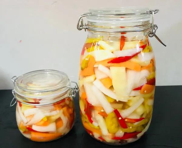 4.酸辣可口,清爽開(kāi)胃的蘿卜泡菜就做好了,放入玻璃器皿中,放冰箱冷藏,第二天就可以開(kāi)吃啦。
