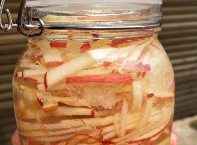 5.瓶口封上保鮮膜,蓋上蓋子,在較溫暖處呆上三個(gè)月以上,那時(shí)蘋(píng)果全部呈黃褐色且干枯狀浮于醋中,而醋卻呈現(xiàn)清亮的金黃色時(shí),即可開(kāi)蓋享用。
