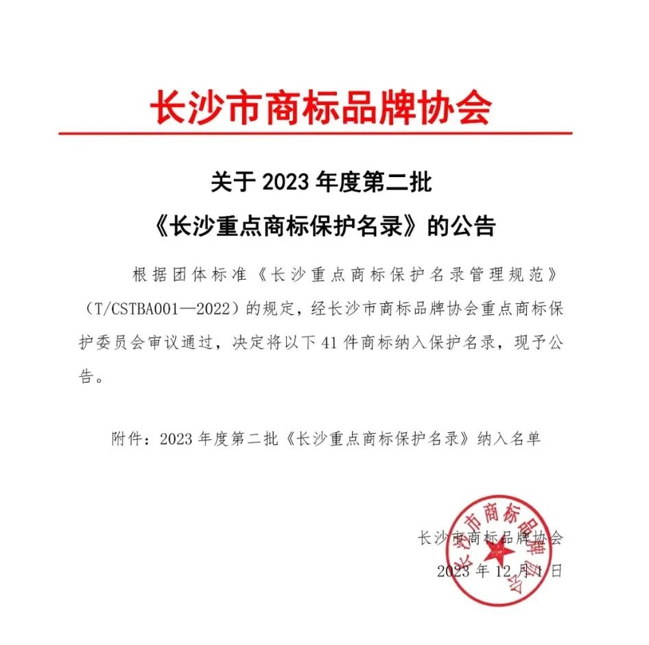 近日,為進(jìn)一步加大注冊商標(biāo)專用權(quán)保護(hù)力度, 2023年度第二批《長沙重點(diǎn)商標(biāo)保護(hù)名錄》正式公布。長康品牌成功入選。
